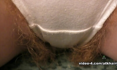 Curvy hairy brunette Samantha Jane plays with her pubic hair through her semi-transparent panties